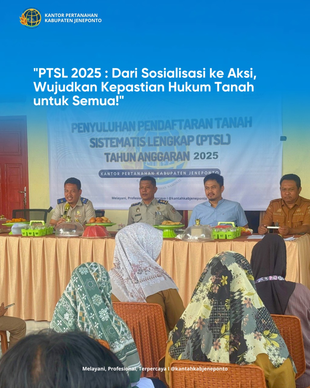 Dalam penyuluhan ini, masyarakat diberikan penjelasan mengenai tahapan, persyaratan, dan manfaat dari program PTSL sebagai upaya percepatan pendaftaran tanah di seluruh wilayah Kabupaten Jeneponto.