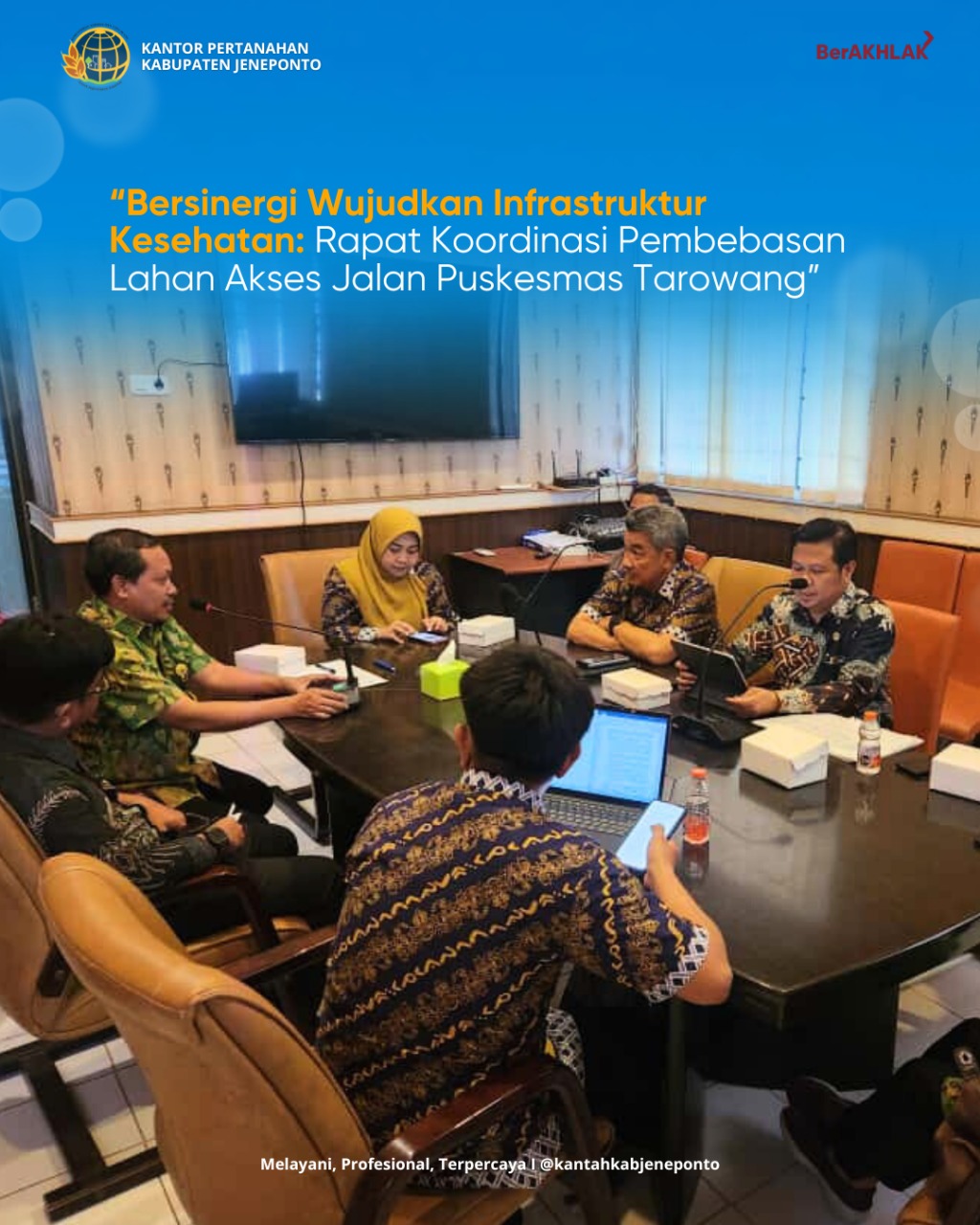 RAKYAT NEWS, JENEPONTO — Dalam upaya meningkatkan pelayanan kesehatan, Kantor Pertanahan Kabupaten Jeneponto menggelar Rapat Koordinasi Pembebasan Lahan Akses Jalan menuju Puskesmas Tarowang, Kamis (23/10/2025). Kegiatan yang berlangsung di Kantor Dinas Kesehatan ini melibatkan berbagai instansi, termasuk Dinas Kesehatan, Badan Pengelola Keuangan dan Aset Daerah (BPKAD), Dinas Perumahan, Kawasan Permukiman dan Pertanahan (Perkimtan), serta Badan Pertanahan Nasional (BPN) Jeneponto.