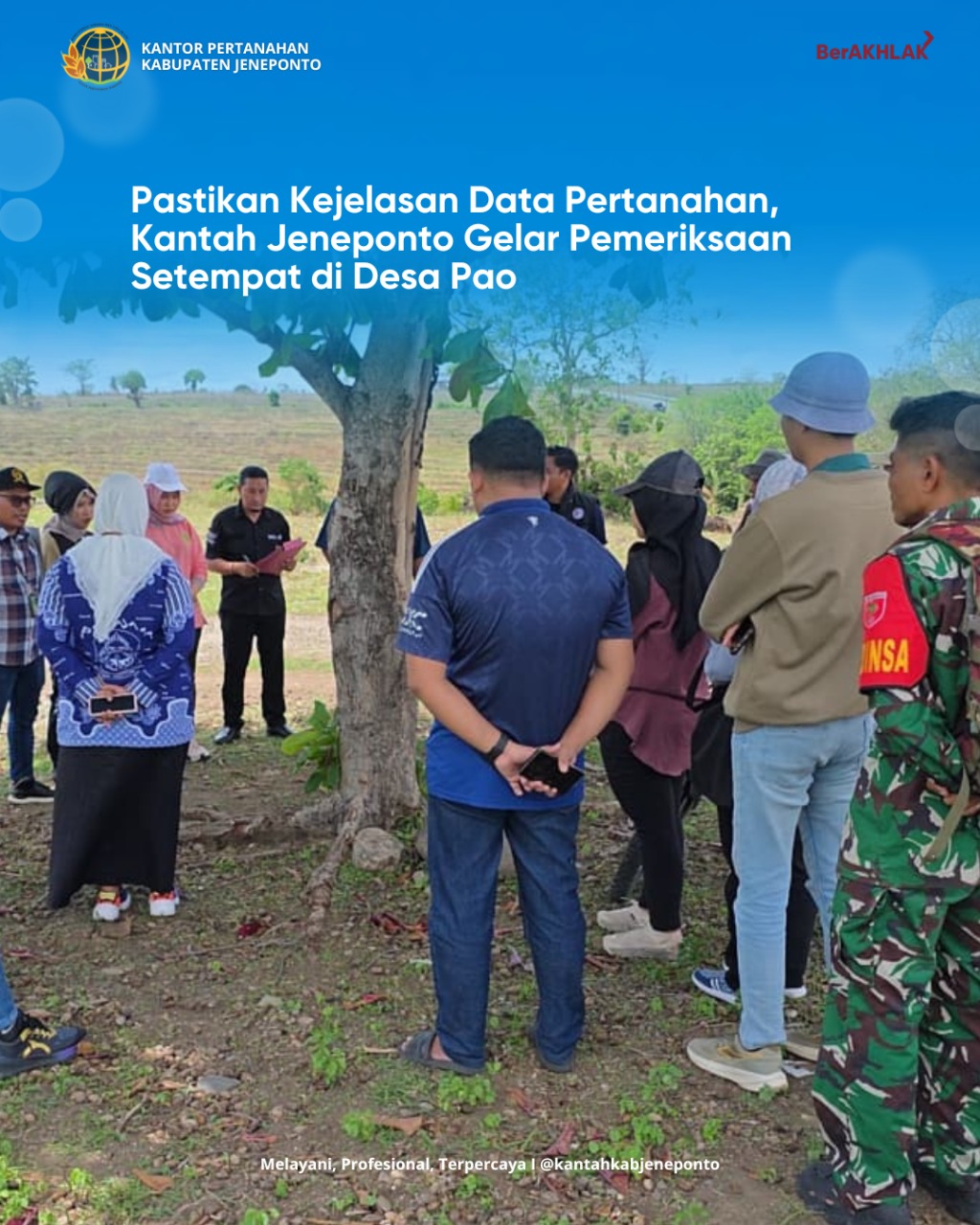 RAKYAT NEWS, JENEPONTO — Kantor Pertanahan Kabupaten Jeneponto kembali menunjukkan komitmennya dalam memastikan ketepatan data pertanahan melalui kegiatan Pemeriksaan Setempat yang dilaksanakan di Desa Pao, Kecamatan Tarowang, pada Jum’at 21 November 2025.