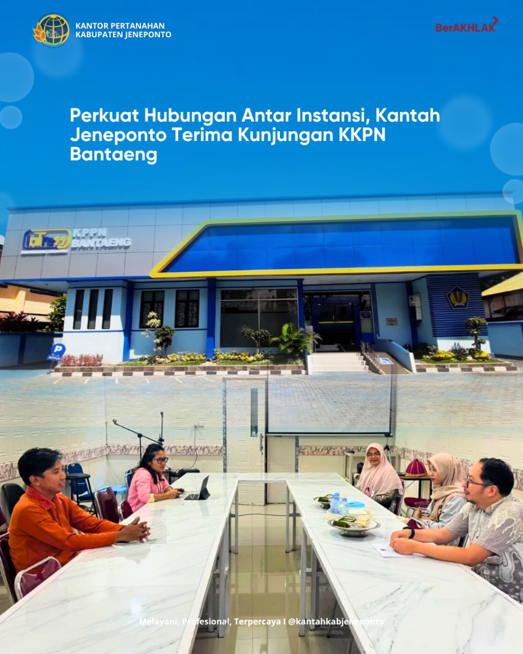 RAKYAT NEWS, JENEPONTO – Jajaran Kantor Pertanahan Kabupaten Jeneponto menerima kunjungan kerja dari KKPN Bantaeng pada Jumat, 28 November 2025. Kunjungan yang dilaksanakan di kantor Kantah Jeneponto ini bertujuan untuk memperkuat sinergi antar instansi dalam rangka meningkatkan kualitas pelaksanaan anggaran serta mempererat koordinasi terkait tugas dan fungsi pelayanan pertanahan.