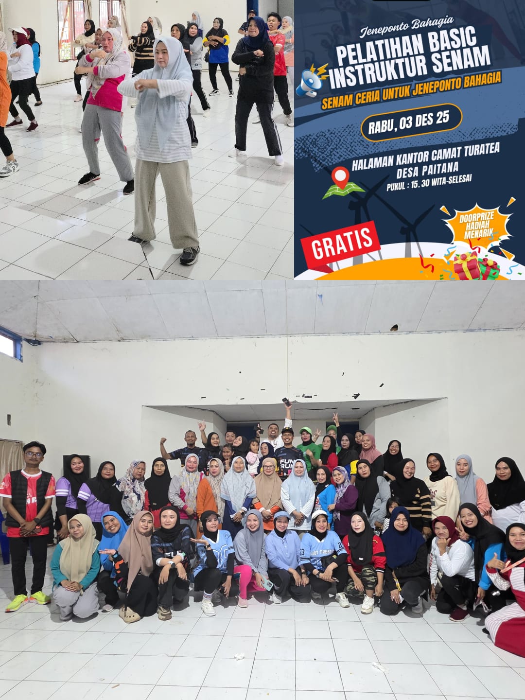 RAKYAT NEWS, JENEPONTO – Pelatihan Basic Instruktur Senam yang diselenggarakan oleh Dinas Pemuda dan Olahraga melalui Bidang Pembudayaan Olahraga Kabupaten Jeneponto berlangsung meriah di Aula Kantor Camat Turatea dan Lapangan, Rabu (3/12/2025).