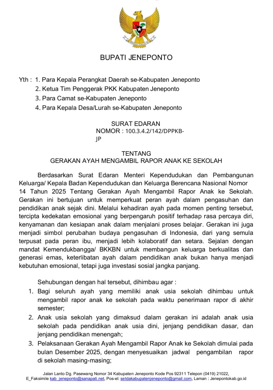 RAKYAT NEWS, JENEPONTO – Bupati Jeneponto secara resmi menerbitkan Surat Edaran yang mendukung para Ayah untuk mengambil rapor anak di sekolah. Kebijakan ini merupakan langkah strategis untuk memperkuat partisipasi aktif Ayah dalam pendidikan dan pengasuhan anak di Kabupaten Jeneponto.