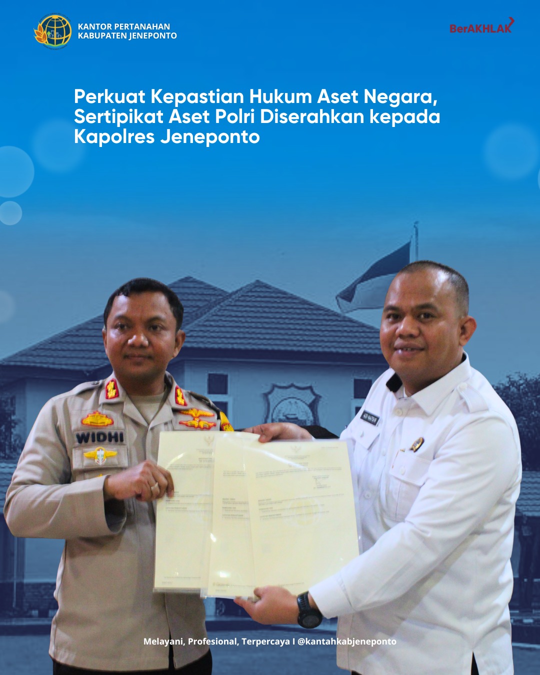 Penyerahan sertipikat aset tersebut merupakan bagian dari upaya mendukung tertib administrasi serta memberikan kepastian hukum atas aset negara, khususnya aset milik Kepolisian Republik Indonesia di wilayah Kabupaten Jeneponto. Sertipikasi aset ini diharapkan dapat memperkuat legalitas kepemilikan dan mendukung pengelolaan aset negara yang lebih tertib dan akuntabel.