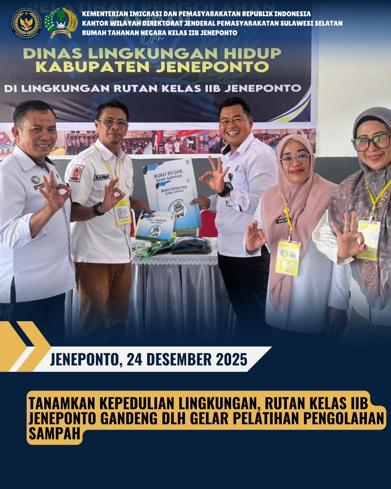 RAKYAT NEWS, JENEPONTO – Rumah Tahanan Negara (Rutan) Kelas IIB Jeneponto melaksanakan Pelatihan dan Pembimbingan Pengolahan Sampah bekerja sama dengan Dinas Lingkungan Hidup (DLH) Kabupaten Jeneponto sebagai upaya pembinaan kemandirian dan peningkatan kepedulian lingkungan bagi warga binaan. Kegiatan berlangsung di Rutan Jeneponto, Rabu (24/12/2025)
