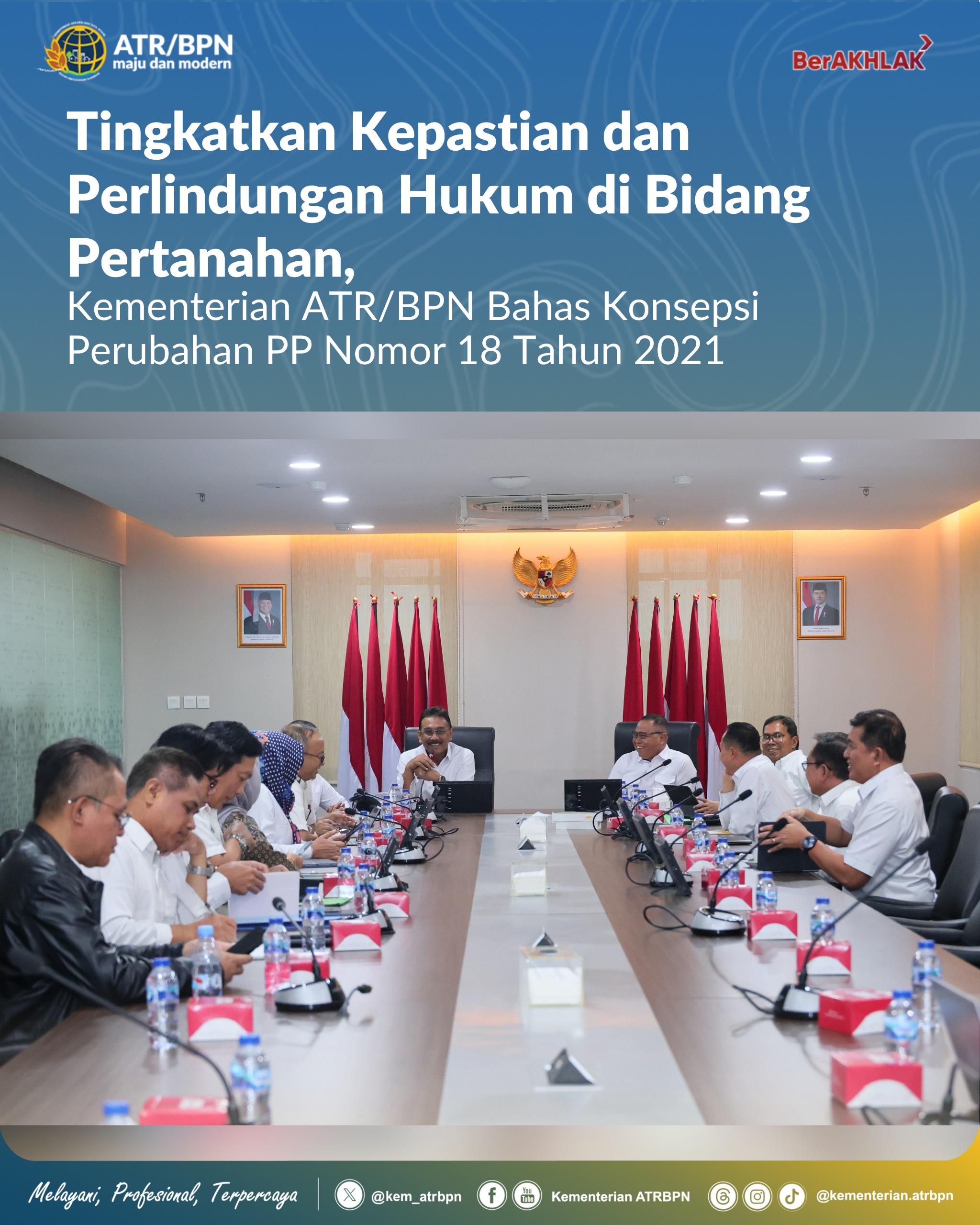 “Perubahan kebijakan ini harus mampu memberikan kepastian dan perlindungan hukum, baik bagi masyarakat maupun bagi jajaran Kementerian ATR/BPN di pusat dan daerah. Aturan yang disusun harus jelas, operasional, dan dapat diimplementasikan secara aman hingga ke daerah,” Inspektur Jenderal Kementerian ATR/BPN, Pudji Prasetijanto Hadi, dalam arahannya.