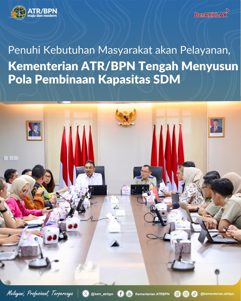 RAKYAT NEWS, JAKARTA – Kementerian Agraria dan Tata Ruang/Badan Pertanahan Nasional (ATR/BPN) tengah menyusun progres pembinaan kapasitas sumber daya manusia (SDM). Pembinaan SDM dinilai penting mengingat kompleksitas tugas serta tantangan pelayanan publik yang terus berkembang. Oleh karena itu, diperlukan penyelarasan dan peningkatan kompetensi pegawai.