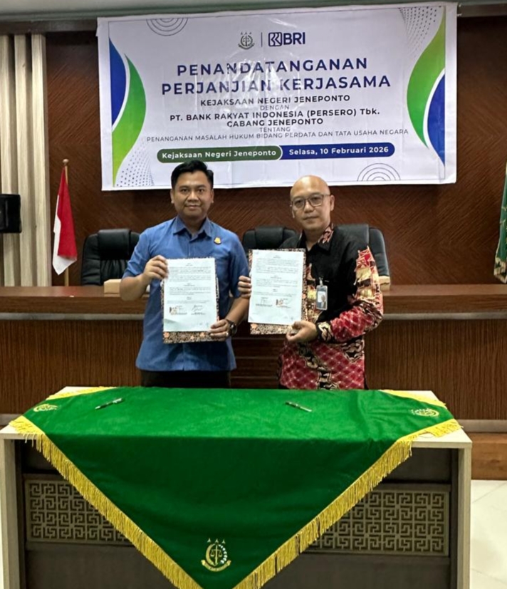 RAKYAT NEWS, JENEPONTO – Dalam upaya memperkuat penanganan aspek hukum di bidang perdata dan tata usaha negara, PT Bank Rakyat Indonesia (Persero) Tbk Cabang Jeneponto dan Kejaksaan Negeri (Kejari) Jeneponto resmi menjalin kemitraan strategis. Kerja sama ini diteken melalui penandatanganan Perjanjian Kerja Sama (PKS) yang berlangsung di Aula Lantai II Kejari Jeneponto, Selasa (10/2/2026).