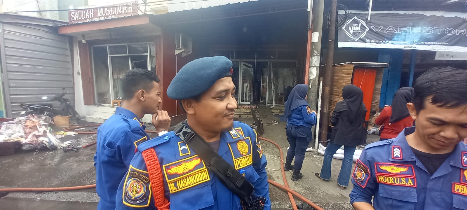Pantauan di lokasi sekitar pukul 12.10 WIB, sedikitnya empat unit mobil pemadam kebakaran tiba dan langsung melakukan penanganan pada titik api yang berada di dalam ruangan toko Saudah Muslimah.
