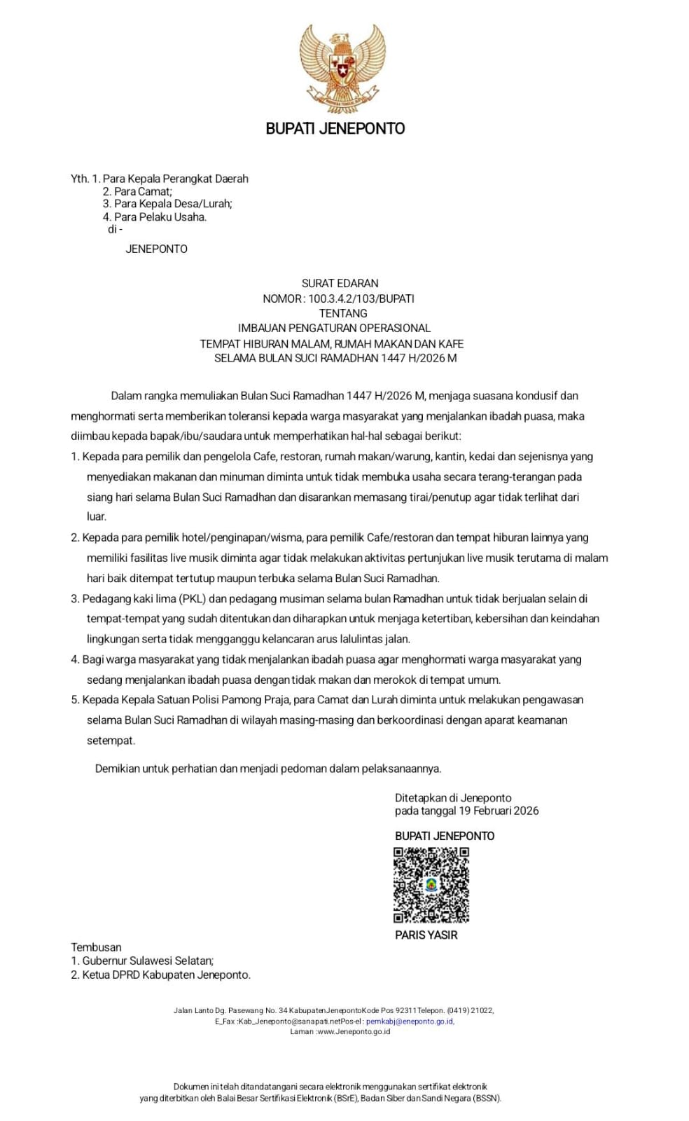 RAKYAT NEWS, JENEPONTO – Bupati Jeneponto, H. Paris Yasir, S.E., M.M., resmi menerbitkan Surat Edaran Nomor 100.3.4.2/103/BUPATI tentang Imbauan Pengaturan Operasional Tempat Hiburan Malam, Rumah Makan, dan Kafe selama Bulan Suci Ramadhan 1447 H/2026 M.